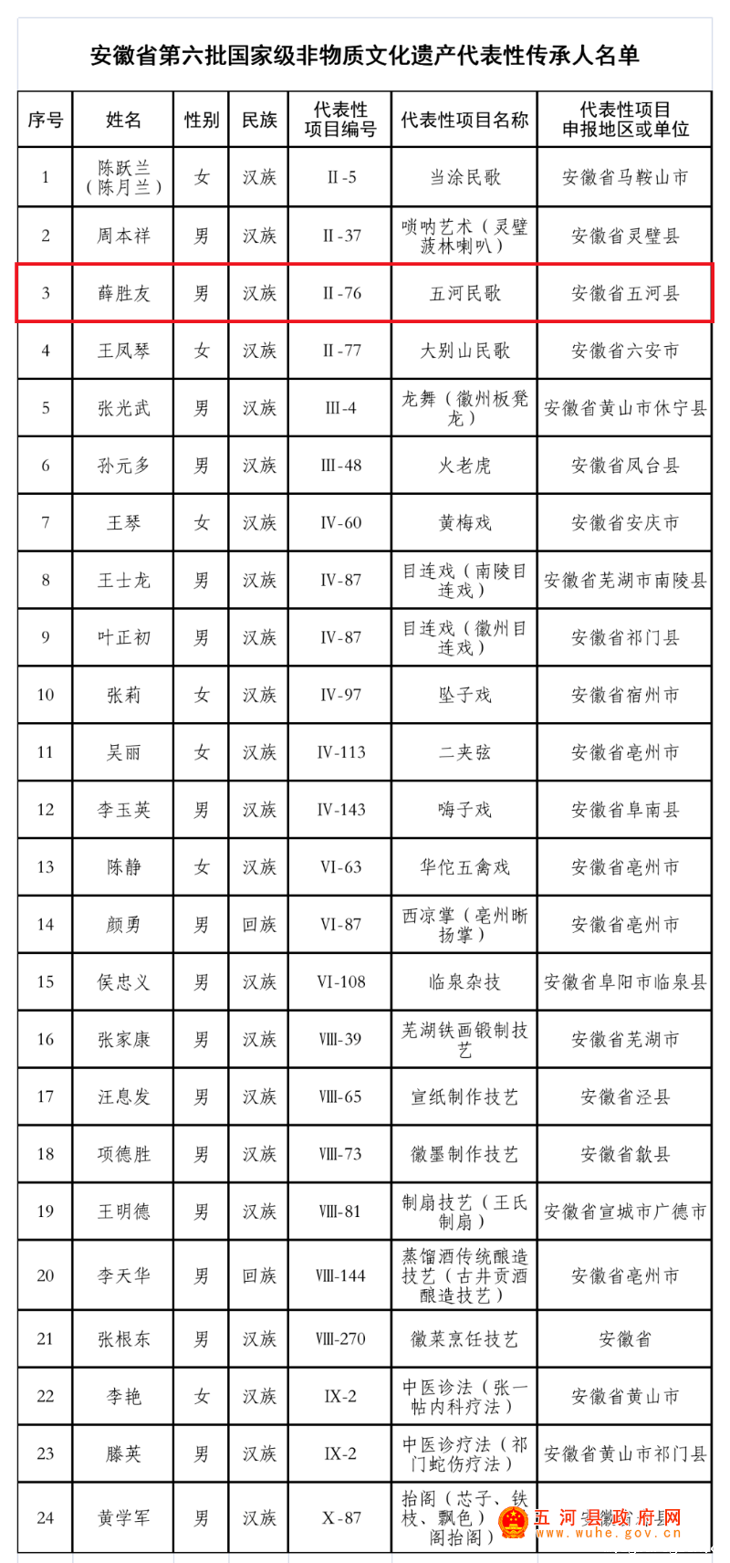 3月17日,文化和旅游部印发《关于公布第六批国家级非物质文化遗产代表性传承人的通知》(文旅非遗发〔2025〕23号),公布第六批国家级非物质文化遗产代表性传承人名单(942人)。安徽陈跃兰(陈月兰)、周本祥、薛胜友等24人入选,至此,安徽国家级非遗代表性传承人数量达到143人。